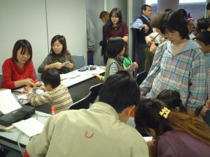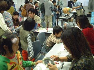 | 天文ブースでは,ミニ星座早見+月齢早見の作成や, 生まれたときの星座をパソコンで見せたりした. | |