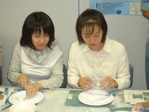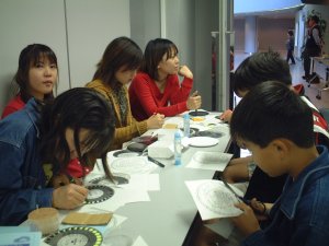 左は鉱物関係の実習で勾玉を作っているところ. 大人気. 交替で休憩中のうちの学生も参加. |