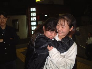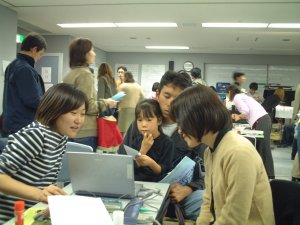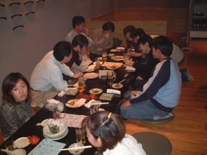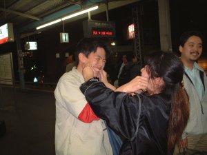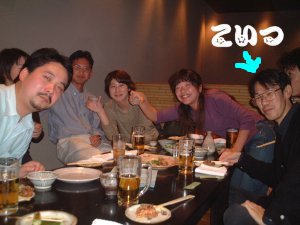 スタッフ・在校生・OBが20人ぐらい入り乱れた状態. 左上は,かず&かおるちゃんラブラブ発表があった直後の暴発状態. 店が開いた直後の5時すぎから始めたから8時には終わると思ってたけど, この発表で一気に終電まで伸びた. 下は,天下の公共スペース JR環状線福島駅のプラットフォームで. |