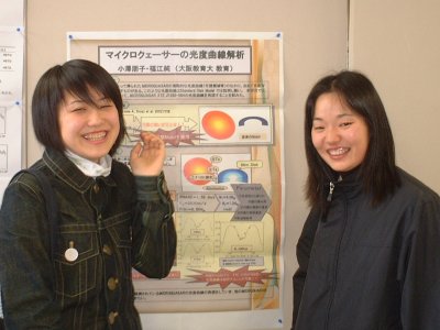 夜の部: かなり弾けている危ない二人. 12時からは大人の時間というわけだかどうだか知らないが, 学生や院生は12時に先に帰った. でも,西はりま天文台の悪代官ナルナルの呼び出しで, また呑みに連れ出されたものもいるという話だ. 一方で,2時まで続いた大人のテーブル, 何話したか覚えてないよお. まぁ,誰が居たか覚えているだけマシか… |