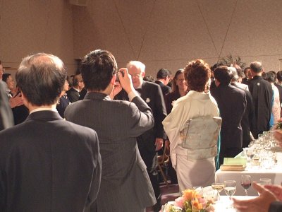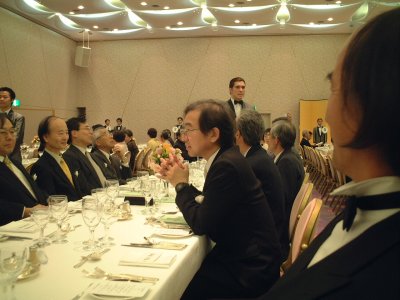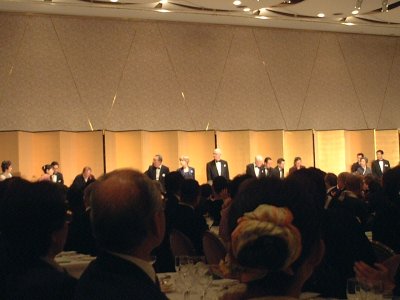 雛壇。すごく遠い(笑)。 真ん中に二人立っている、左側が先端技術部門の受賞者で、 右側がパーカー教授。て言ってもわかんないよなぁ。 なんせ、ホテルの地下2階にあるプリンスホールてらいう大広間で、 1000人近く入っていた部屋の後ろの方だったもんで。 |