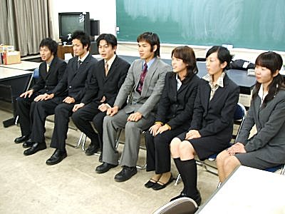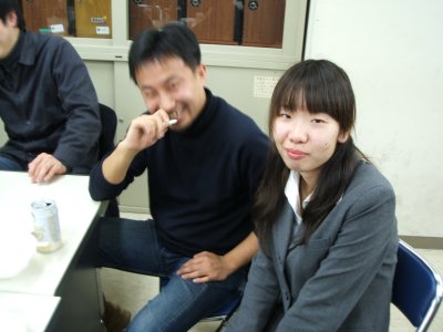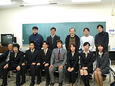 パーティ(1次会)の最後に記念撮影。 修論生は一人だけなのだが、なぜだか、 真ん中で堂々と座っているのは卒論生の西山クンで、 その隣が、最後までエラソウにできなかった修論生の道頭クン。 |
