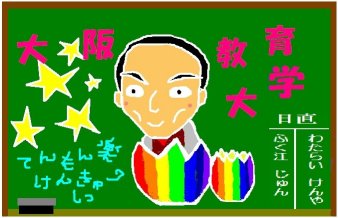 ポスター。 左から、H46ポスター(渡会くん)、H47(西山くん)、 H48(川田くん)、H49(福江)、 H50(秋月さん)、S02(福江)。 H46からH50までは、高密度分科会のポスターで続いているのだが、 よく見るとどのポスターにも、緑色の大阪教育大学ロゴが貼ってある (デザイン;秋月+西山)。 いかにも大阪風のドギツイ配色である(笑)。 目立ってナンボの精神だけど、OHPでも使ったのは少し恥ずかしかった。