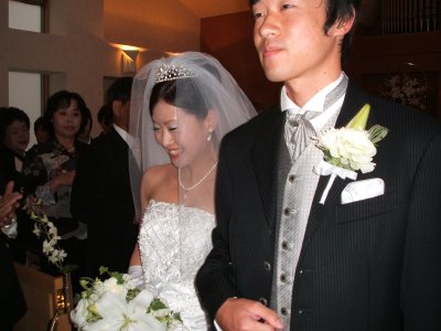 バージンロードを歩く花嫁 教会式(プロテスタント)だったので、 ぼくたちも式に参列。 |