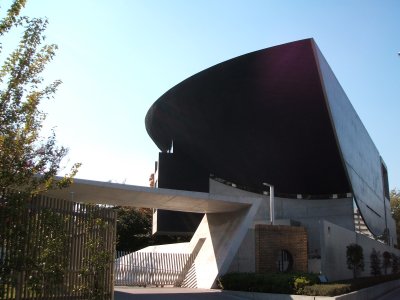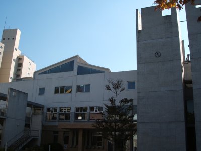 北野高校の本館正面 いやぁ、びっくり、高校の校舎とは思えないような モダンでユニークな造りだ。 卒業生の設計だとか。 そういえば、北野高校の卒業生には、手塚治虫とか、 業界だと松田卓也さんだとか、 いろいろ有名人も多い。 |