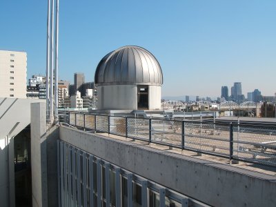 天文台 講演の前に吉田先生が案内してくれたのだが、 なんと北野高校には立派な天文台があった。 北野高校は噂に聞く通りの文武両道で、 50m泳げないと卒業できないとか、 縄跳びの二重跳びも何回とかできないといけないとか、 ああ、北野でなくてよかったぁ。 |