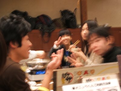 一次会 となりのテーブル;新婚OBの成田くん。 フラッシュを切ってたせいで、かなりぶれてしまった。 |