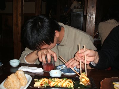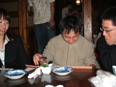 一次会後半 葵ちゃんの沐浴を済ませて、 一次会の半ばぐらいに渡会くんが登場したので、 席とメンツを移動した。 早速まわりに、 最近の葵ちゃんの写真とムービーを見せている(^^;渡会くん。 子育てに忙しい渡会くんは、呑み会も久しぶりで、 急ピッチで弾けていた(笑)。 |