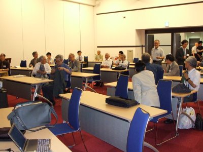 総会・講演会の会場風景。 後ろの方に立っている平田さんには、 夏の学校と合わせて、 ほぼ同じ話を2度聞かせてしまった(笑)。 |