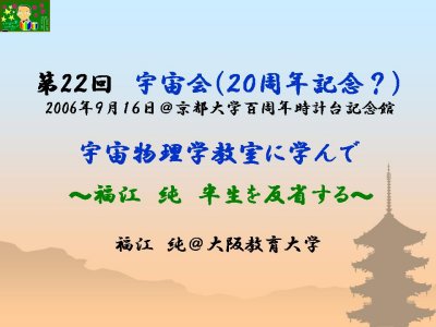 講演パワポの最初のページ。 結局、今回の宇宙会は、何回目なんだぁ? 総会としては22回目で、 周年としては21周年? |