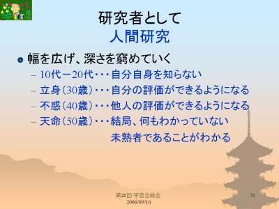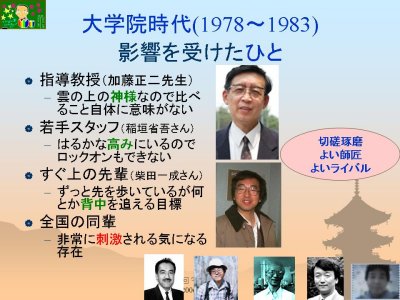 ここはかなり変えた。 当時の教室スタッフが頼りにならない、と繰り返していたら、 司会の柴田さんが“おいおい、そんなこと言っていいのか” とチャチャ入れてきた。というのも、会場には 当時の教授陣(川口先生や小暮先生)もどーんとおられたからだ。 だけど、大学院の頃に、“スタッフは役に立たない”って、 一番声高に叫んでいたのは、柴田さん、あんたでしょ〜♪ |