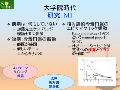 一応、研究の話も、途中途中で、 ・相対論的降着円盤の振動(修士のころ) ・降着円盤のシルエット(就職したてのころ) ・相対論的輻射流(最近のもの) と3つほど織り交ぜた。 |