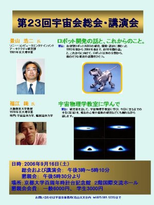 宇宙物理学教室にゆかりがあった人は誰でも入れるからだ。 20年ほど前に、故 能田忠亮先生を会長に、 久保田さん、川端さん、故 椿さん、岩崎さんら中堅OB, 柴田さん、ぼくなどの下っ端OBらで立ち上げた組織だ。 誰もが数年で雲散霧消するのではないかと思っていた中、 よく20年以上も続いたもんである。 例年、秋口に、総会兼懇親会があるのだが、 今回は、一応、20周年記念というような感じで、 京都大学百周年時計台記念館の2階国際交流ホールで開かれたものだ。 ぼく自身は、このところ忙しくて何年も総会に出席しておらず、 形だけの幽霊役員状態だったが、今回、久しぶりに参加した。 |
