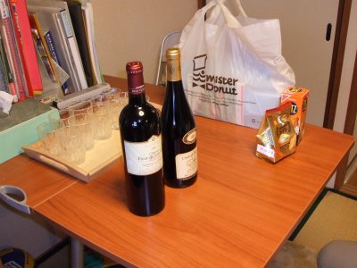 本日の主賓 右が主賓のヌーボー。 左は重めのミディアムで、 テイスティング用にぼくが持って行った、 ちょっといい目の赤(笑)。 |