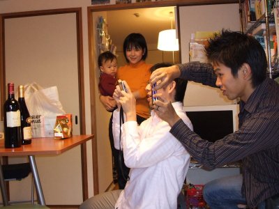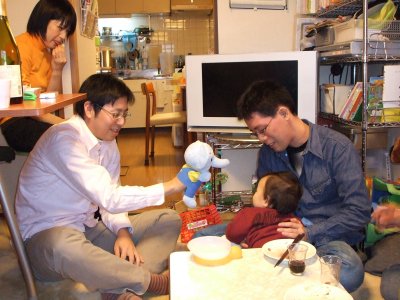 | ボジョレヌーボーが出たので、 渡會家でワインパーティが開かれた。 渡會家ではいままでにもワインパーティや新年会など、 何度もパーティがあったが、 遠いし都合が悪かったりして、参加していなかった。 今年もメチャ忙しくてパーティに行っている暇なんかないはずだけど、 ヌーボーと噂に聞く舞子さんの手料理に惹かれて…。 誘惑に弱い? | |