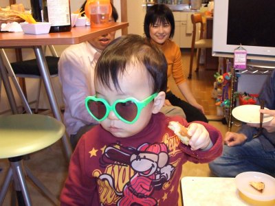 主役登場 いよいよ本日の主役登場である。 パーティ開始の1時には健やかにお休み中だったのが、 目が覚めたと同時に腹減ったの大音声。 まぁ、赤ん坊が泣くのは3種類しかないけどね。 しかし、旺盛な食欲である。 |