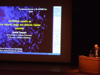 講演風景 降着円盤の標準モデルを作った一人、 サニアエフ(Rashid Sunyaev)の講演風景。 大ホールは1階から2階にまたがった階段ホールで (階段を折り畳むとパーティ会場になる)、 真ん中へんからだと演台は遠くてよく写らないぐらいだ。 |