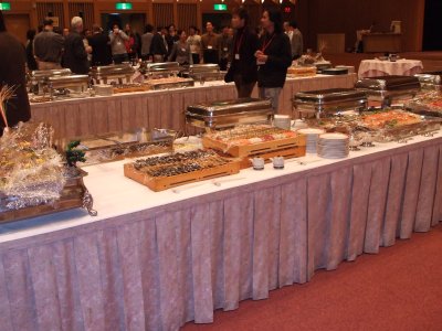 バンケット 学会の懇親会はコストパフォーマンスが悪いので出ないことも多いが、 国際会議は料理やお酒がそこそこなことが多いのでたいてい参加する。 さらに、今回のすざく会議は、参加費がタダだというぐらい、 かなりリッチっぽい会議だったので、 バンケットも大いに期待していたら、 おおお、期待通りの料理っぽいぞ。 |