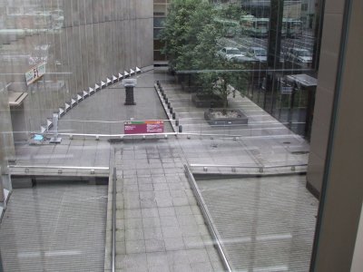 会場の中庭 会場はおおきく東棟(大ホール側)と西棟(各種会議室)にわかれていて、 間にはなんだか無駄に広い中庭が存在していた。 |