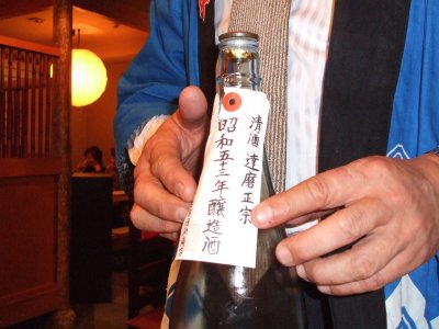 30年モノの古酒 第3週のメイン祭で大将がもってきてくれた、30年寝かせた古酒。 さすがに30年モノの古酒はなかなか手に入らず、 あちこち探してやっと手に入れたらしい。 ワインやブランデーなどと違って、お酒は寝かせて古酒にしても、 芳醇になるわけではなく、ひねたような枯れたような味になって、 (ぼく的には)決して美味しくなるわけではないと思う。 しかしまぁ、なんというか珍しいのは間違いない。 30年モノの古酒なんて呑むのは、おそらく最初で最後だろう。 |