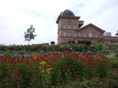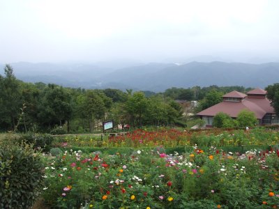 中日。 天気は悪くなったが、花畑は北館とよく合う。 |