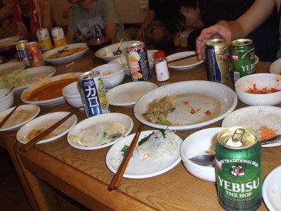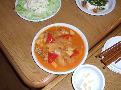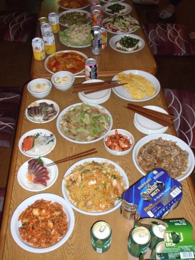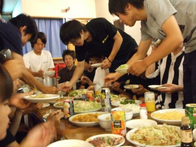 2日目の夜の恒例料理大会。 今年は料理の種類がかぶることもなく、 ほぼ時間通りにはじまり、 中華風やパスタ系や和風など、 満遍なく美味しい料理が出てきた。 左下隅は、スタッフ部屋桂印謹製の豚キムチ。 あ、一番奥に、よく煮込んだ鳥クリームシチューがあったのが、写っていない。 |