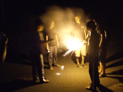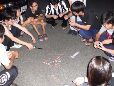 花火タイム。 料理大会の後は、花火大会。 西はりま天文台は大撫山という山の上にあるので、 山火事の危険があるため花火は禁止だったのだが、 最近は、打ち上げでなく、手持ち花火なら、 後始末をきちんとすればOKになったらしい。 |