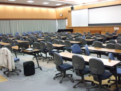 大セミナー室に一番乗り。歳を取るとそれなりに図々しい(笑)。 広い大セミナー室いっぱいに机が用意されていて驚いたが、 今回は参加者が何と150人ぐらいにもなるらしい。 実際、はじまってみると、満杯だった。 |