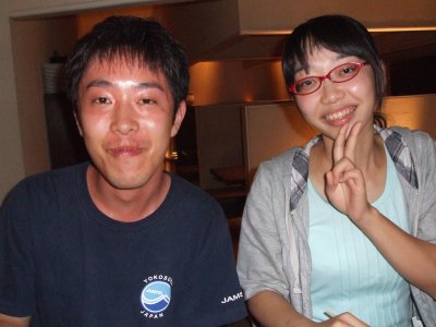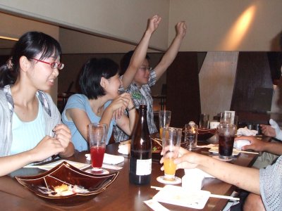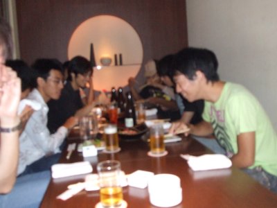 2日目の夜の打ち上げ。 右方向のテーブルで、こっちも8人ほど、ただし白い。 |
