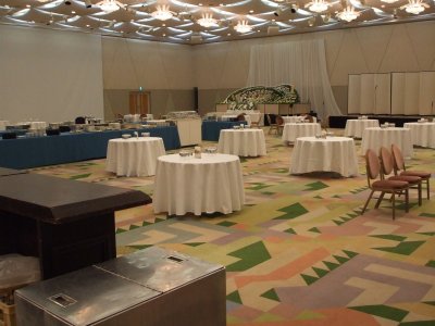 地下1階のプリンスホール 開始の1時間ぐらい前に着いてしまった。 準備中の会場風景。 献花台やビュッフェがみえる。 |