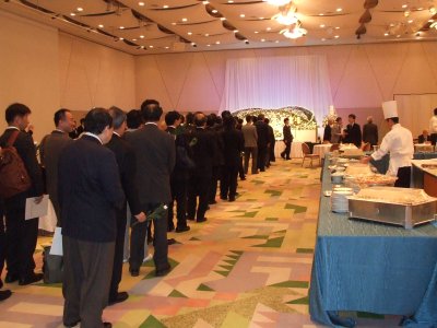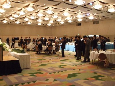 懇親会 いろいろな思い出話を聞いたり、スライドや展示をみながら、 懇親会が3時間ほどあった。 椅子も少しはあったけど、若輩者が座るわけにもいかず、 いやぁ、足が棒になってしまった。 おまけに、昨日の今日で、美味しい料理もあまり食べられなかった。 天文関係者がわんさか集まっているので、 そこかしこで、いろいろ仕事の打ち合わせもやってたみたい。 |