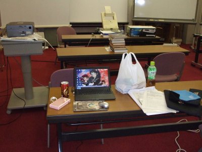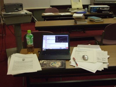 一番乗りの特権で、スクリーンが見えやすい場所に陣取って、 ノーパソも立ち上げ、講義資料も印刷してきて、準備万端の状態。 |