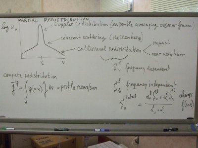 さてどうしよう??? 長年にわたり、相対論・流体力学・電磁流体力学などの手法は一通りやって、 最後に取っておいた分野が、輻射輸送・輻射流体力学である。 そして、この数年というか10年近く、ついに輻射輸送にも取り組み初めて、 ブラックホール降着流やブラックホール風に関連して、 相対論的な輻射輸送および相対論的輻射流体力学を調べてきている。 そして自分自身で輻射輸送の講義までしているのだが、 現在の日本では輻射輸送の専門家は、一世代前はリタイアしていて後継者がおらず、 この分野はほとんど壊滅状態で、こっちもほとんど独学だった。 そのため、今回の講義内容の前半あたりは知っているし理解もできているが (これは後にウソだとわかった)、 後半あたりは知ってはいるものの十分には理解していない。 分野的には太陽物理に偏ってはいるものの、役に立つ内容もとても多そうだ。 また、この際に、数値的な手法も勉強しておきたい。 そこで、わざわざこの講義のために馬鹿高いIDLを購入して、 (というか、貧乏な天文分野で、なんで、IDLがOKなの?)、 4日間ほど受講してきた(最終日はすでに別件の講演が入っていた)。 しかし、この歳になって集中講義を聴くことになるとは思わなかったが、 しかも先週はこっちが大阪市大で集中講義を実施してきたばかりだし(笑)、 でも、久しぶりに、学生に返ったつもりで、(昼は)しっかり勉強してきた。 参考までに、講義プログラム: Morning lecture hours: hour 1: 09:00-09:45, hour 2: 10:00-10:45, hour 3: 11:00-12:00 Afternoon excercises 13:30-17:00 Monday: basic stellar spectrum formation hour 1: solar continua hour 2: Fraunhofer lines hour 3: examples: coronal lines, nebular lines, wind lines afternoon: numerical excercises SSA1, SSA2 Tuesday: LTE stellar spectrum formation hour 1: radiation quantities, transfer equation hour 2: LTE continuum and line formation hour 3: examples: HOLMUL, inversion, magnetic bright points afternoon: numerical exercises SSA3, SSB1 Wednesday: resonance scattering in stellar spectrum formation hour 1: Einstein coefficients, bb rates, 2-level scattering hour 2: partial redistribution, bound-free scattering, hot-star continua hour 3: examples: VAL3C continua, VAL3C energy budgets, NLTE masking afternoon: numerical exercises SSB2, SSB3 Thursday: numerical solution schemes hour 1: Lambda operator, Feautrier hour 2: ALI and other tricks hour 3: examples: 1D case studies afternoon: numerical exercises SSC1, SSC2 Friday: chromospheric line formation hour 1: summary of solar spectrum formation, fads & fallacies hour 2: shocks, non-E ionization, cloud modeling hour 3: examples: 2D-3D case studies afternoon: numerical exercises SSC3 |