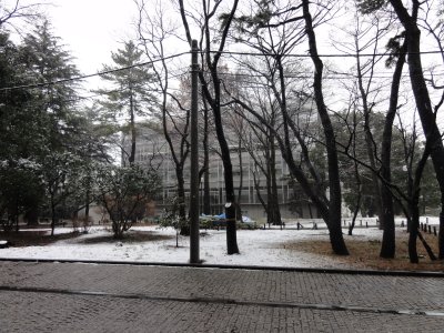 今回の研究会は東大駒場キャンパスであったのだが、 久しぶりの駒場キャンパスも雪景色である。 ただ、それほど寒くはないので、降るはしから溶けていって、 ちょっとベチャベチャ状態で、質が悪い。 |