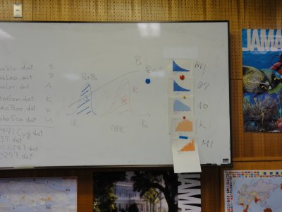 いつも、コンピュータ環境のいいCALL教室で実施している。 これは一日目の実習で、星のスペクトルを分類しているところ。 百年ほど前の研究者がやった作業だ。 分類のヒントはいくつか言ったが、パーフェクトが一人出た。 |