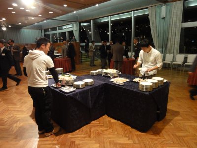 |  | 懇親会へ ワークショップ終了後は、関係者向けにショートパーティの案内があったが、 さてさて、事前に一言聞いてはおいたが、学生を連れて入れるかなぁ。 でもあっさり入れてくれた。 |