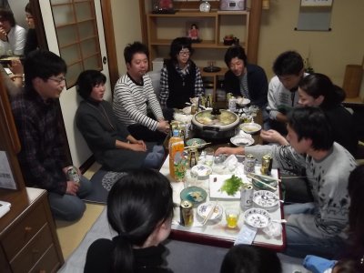 成田+院生登場 6時ちょっと過ぎに、院生5人と一緒に成田くん到着。 30分ぐらい迷ったらしい(笑)。 |