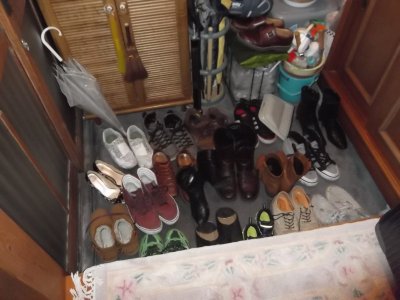 玄関MAX 9時ごろの玄関。 この直後にはち一家がご帰宅だったから、 このときが人数MAXで、ホスト入れて、 大人18人、子ども3人のとき。 |
