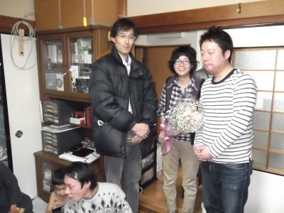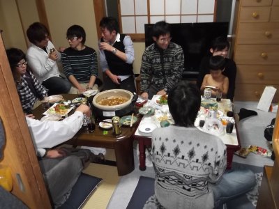 入れ替わり立ち替わり 写真をみると、株ちゃんが来た後、 柳+妹さん+たつのが帰り、 最後の田鍋くんが着いて、 だいたい一部屋へ収束した時分、11時ぐらい。 このすぐ後に成田くんと斉藤くんが帰ったようだ。 |