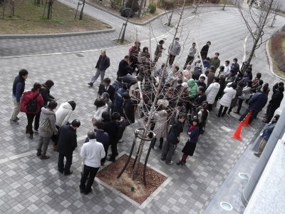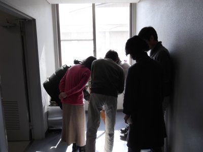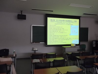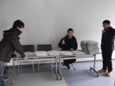 11時ぐらいには学生も何人か手伝いに来てくれて、 (力の必要な)設営や配付資料の整理などをしてもらった。 今回は2回目なので、任していても適当にやってくれて、 こちらは、講師の人たちとの打ち合わせ(雑談)をしていた(笑)。 |