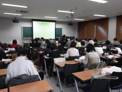 100人定員の215講義室がほぼ満杯である。 |