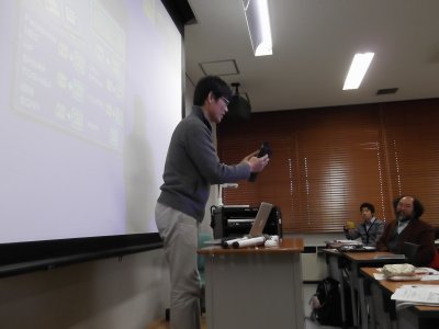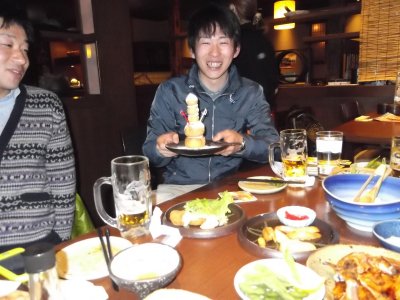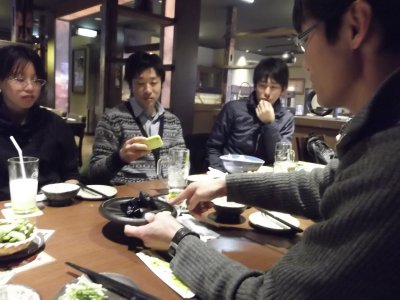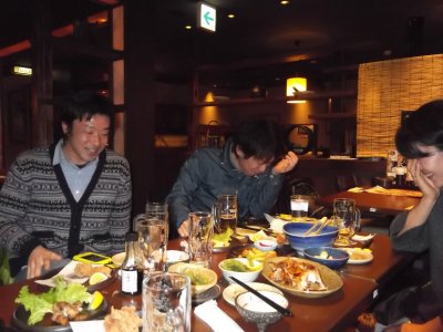 世話人や学生など10人ほどで打ち上げに。 寒い日だったけど、生ビールが美味しい! 今回も5時前から飲み始めたが、 ジョッキがバンバン空いていく(笑)。 何か説明している時政さん。 |