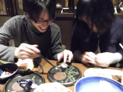全員の団結のもと(笑)、トイレに行っていた野口くんが、 何一つ疑いもなくカラシ寿司を口にした。。。ちょっと可哀相(爆) |