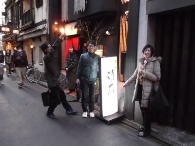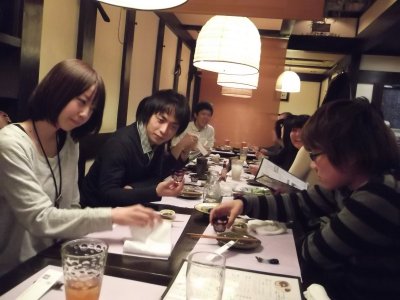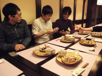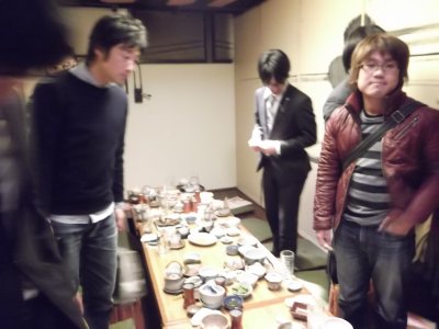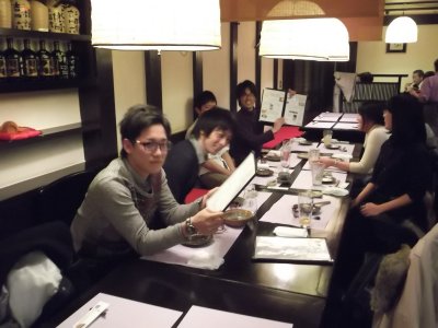 3日目の夜(夕)のセッションは、まぁ、1回ぐらいは、 京都らしいお店に行こうかということで、 やや高めだけど、2日目の秘密会議をしたお店へ行くことにした。 予約の電話を入れたら、まだ準備中だったけど、OKが出て、 結局、4時過ぎからスタート。 スタート時には、学会の会場に居た学生とぼくと合わせて7人だったけど (他に東北からのゲストが2人予定していたが)、だんだん増えて。。。 6時過ぎぐらいに院生が2人到着し、 続いて院生(+彼女さん)やOBが3人着いて、12人ほどになった。 さらに7時前にはゲストが2人参加。 最後は、9時ぐらいだろうか、 鹿児島の学会でも一緒に呑んでくれたY加藤くんも参加して、 最終的には15人にもなって、お店のテーブル席をほとんど占領状態(笑)。 後、残っているのは、座敷テーブルが1つとカウンターだけ。 幸いウィークデーだったので迷惑はかけなかったようだけど、 女将さん、お世話になりました。 ちなみに、写真を上から見ていくと何となくわかるが、 テーブルがどんどん長くなっている。 10時前?ぐらいにさすがにお開きになり (1次会だけで5時間以上?)、ぼくは帰ったけど、 翌日に聞いたところでは、何人かは大学へ、 何人かは加藤くんとさらなる修羅場へ向かったらしい。 |