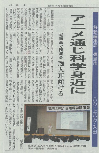 もともと、4月ぐらいに徳島城南高校の秋山先生という方から依頼があって、 SSH指定校ということで、科学講演会かと思っていた。 徳島新聞の移動編集局で各地の高校で実施している講演会の一環として、 今回科学講演会を行うのにSSH指定校である徳島城南高校になったそうだ。 秋山先生という方がハンパじゃないSFアニメ好きの人で、 ぼくに話が回ってきたらしい。 4月以来、いろいろな打ち合わせやバックアップの資料を送ったり、 交通の手配をしてもらったりしていたけど、 当日の段取りなど細かい資料を詳しくチェックする間もなく、 気づいたら、当日になってしまった。 1年生と2年生の生徒や保護者など合わせて700人ぐらいだそうだが、 ふつう、かなりビビるところだけど、そんなヒマさえなかった。 …結局、生徒640人外部聴講者80人の計720人になったそうだ。 |