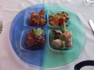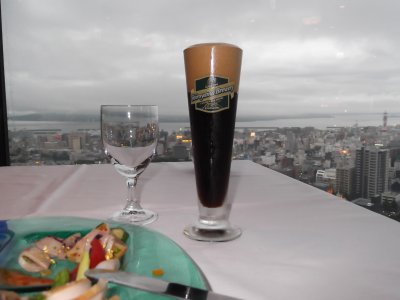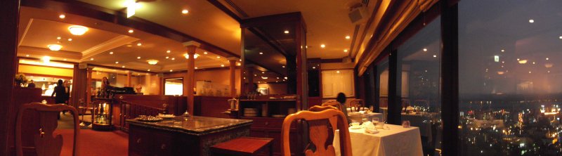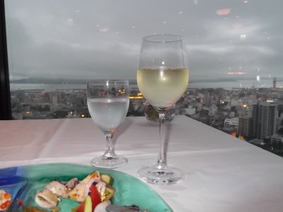 荷物を解いたら、早速にスカイラウンジでホテルディナー。 とはいうものの、大きなプレートのオードブルで、もう十分に満腹。 デザートどころか、メインディッシュまでも進めず(笑)。 |