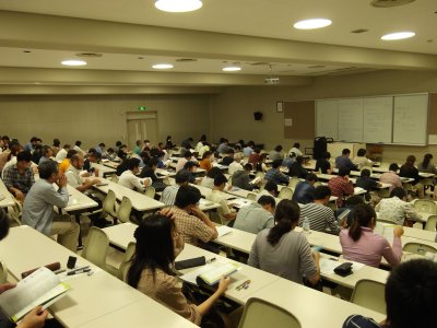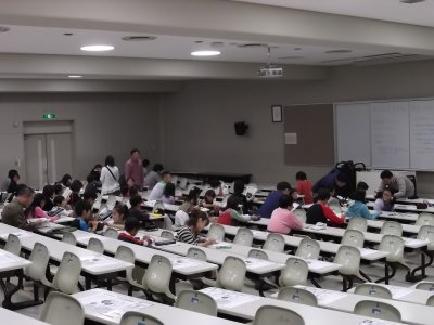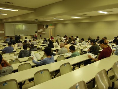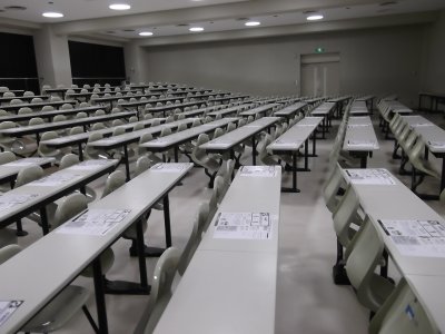 1階ホールで実施した2級と並行して、 2階の教室で実施された1級試験開始直前。 左手側は1階ホールで入りきらなかった2級の受検者で、 1級受検者は部屋の右側のみなので、 さすがに、1級受検者はそう多くはないようだ。 まぁ、2級に比べて、ぐっとレベルが高くなっているし、 アンケートでも難しすぎるとの回答が圧倒的だった。 |