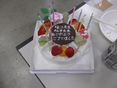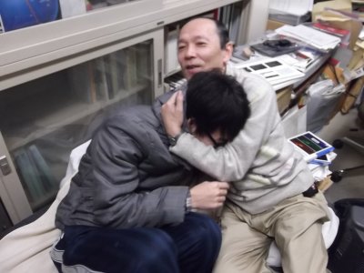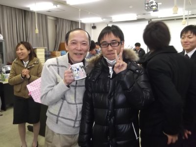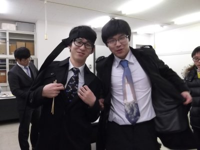 野口くんと藤井くん ネクタイに注目! それぞれに合わせたネクタイは、二人と同回だが、 3年プログラムで来年も在籍する小倉くんが選んでおいたものらしい。 〜筑波の理論懇で見つけておいたもんだ、と言っていたような気がする。 |