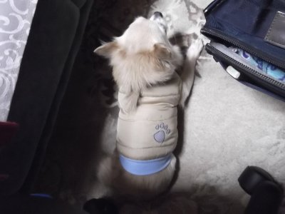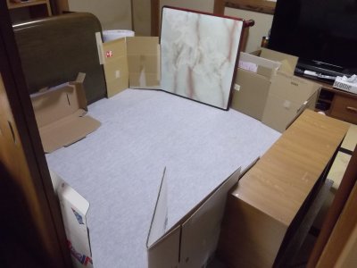 ??? 大型連休の後半、子犬(ちわわ、7歳)を預かることになった。 ちゃちゃ丸とかちゃー丸とかいう。 何年も前から見知った犬だけど、書斎とかで粗相をしてもらっても困るので、 とりあえず、ありあわせで、お犬さまスペースの構築。 手前はいちおう出入り口。 |