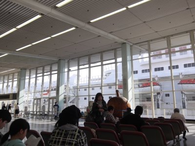 神戸ポートターミナル 9時30分の出港予定まで、 ポートターミナルで待つ。 今回は満席だったそうだ。 ジェット機のエアーショーがあったので、 そっち大好きの人が8割、 ふじ丸大好きの人が2割ぐらいだったらしい。 |